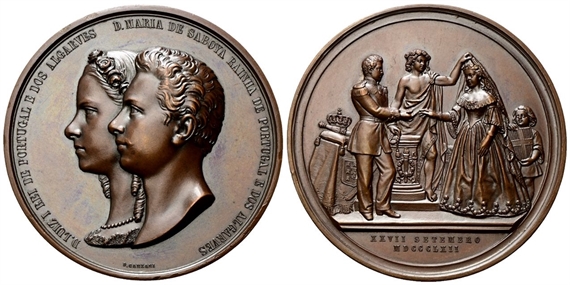 Dr. LUIZ I REI DE PORTUGAL E DOS ALGARVES D. MARIA DE SABOYA RAINHA DE PORTUGAL E DOS ALGARVES. Busti accollati a s.; sotto, D CANZANI. Rv. Scena del matrimonio della Principessa Maria Pia col re Luigi I di Portogallo, nella cattedrale di S. Giovanni a Torino; in esergo, XXVII SETEMBRO / MDCCCLXII.