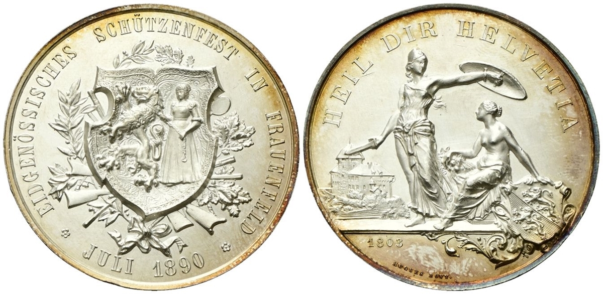 Dr. EID GENOSSISCHES SCHUTZENFEST IN FRAUENFELD. Stemma cantonale sovrapposto a fucili decussati; sotto, JULI 1890. Rv. HEIL DIR HELVETIA. Elvezia stante verso d., con scudo e spada protegge Turgovia seduta verso s..