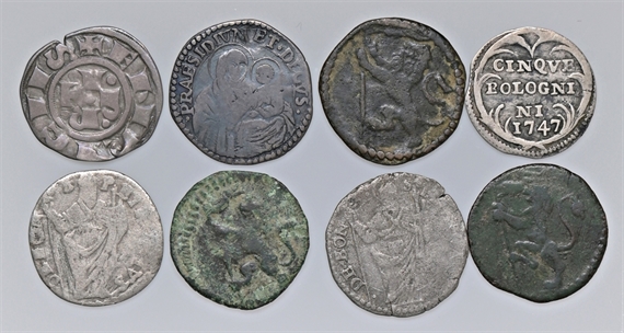 Lotto di 8 monete bolognesi per lo più papali (Alessandro VII,vInnocenzo XI, Clemente XI, Benedetto XIV) ad eccezione di un bolognino grosso a nome di Enrico VI.