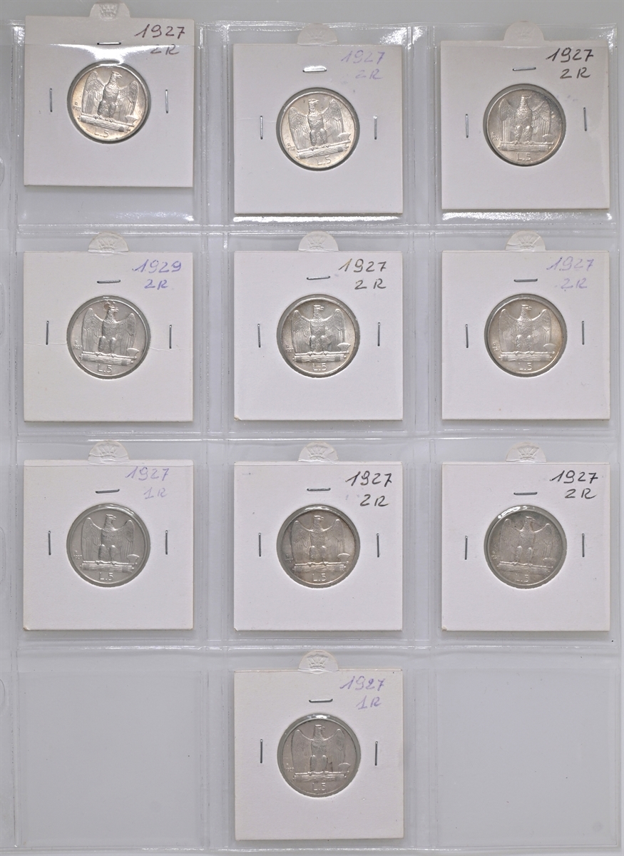 Vittorio Emanuele III. Lotto di n. 10 Aquilini da 5 Lire datate 1927 (9 pezzi) e 1929 (1 pezzo).