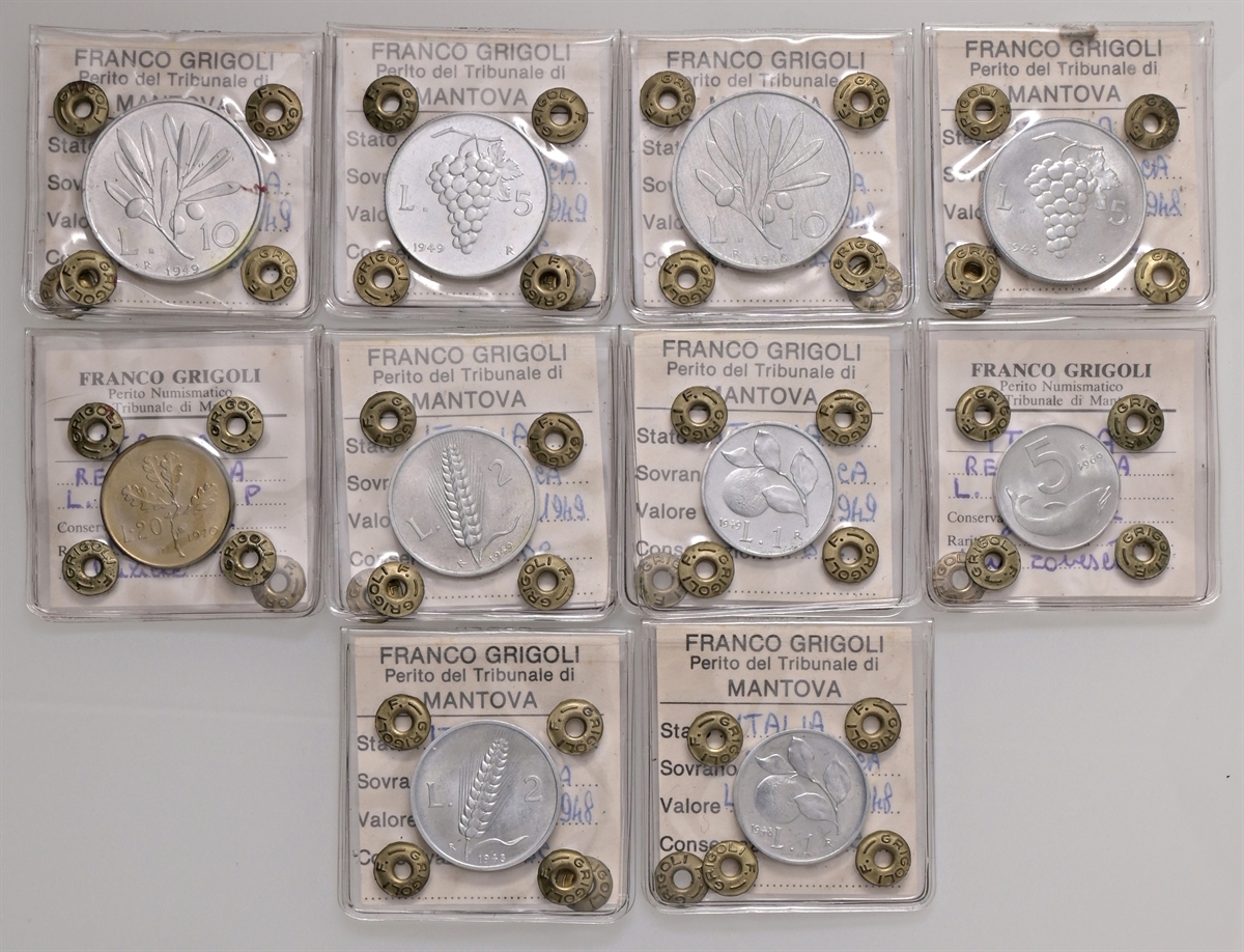 Repubblica Italiana. Lotto di 10 monete: si segnala la serie 1948 (sigillata Grigoli - FDC), la serie 1949 (sigillata Grigoli - FDC) compresa la 2 Lire 1949, 20 Lire 1970 P e la 5 Lire 1969 (1 capovolto) anche queste periziate FDC da Grigoli.