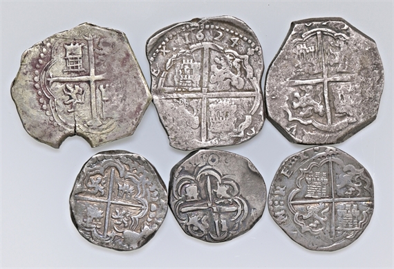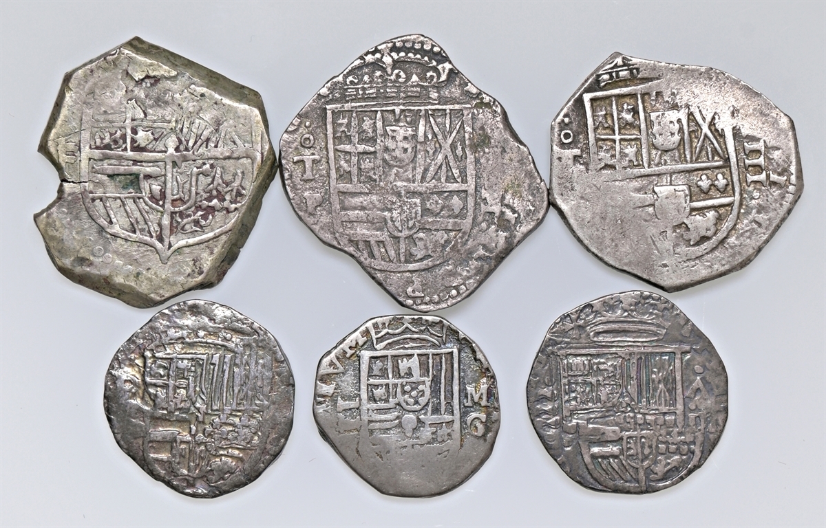 Lotto di 6 maltagliati spagnoli: si segnalano 4 reales 1624 con data perfettamente visibile, 2 reales di Città del Messico, 2 reales Pamplona...