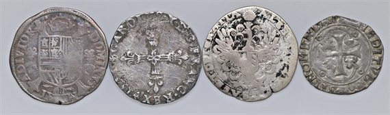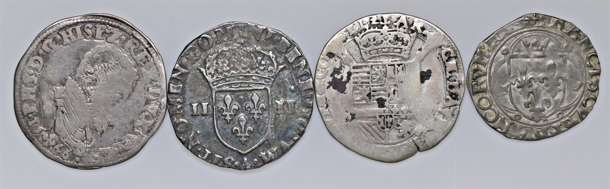 Lotto di 4 monete francesi e olandesi: si segnala quinto di scudo 1566 di Filippo II e un 1/4 quarto di scudo di Carlo X.