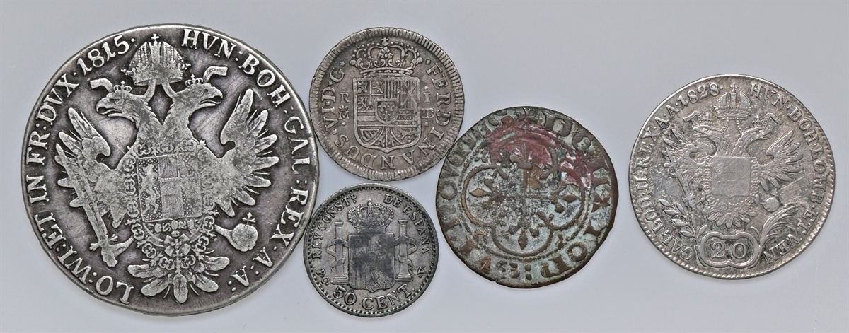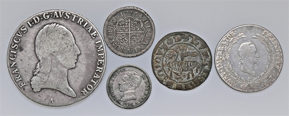 Lotti di 4 monete straniere e un gettone di area francese.