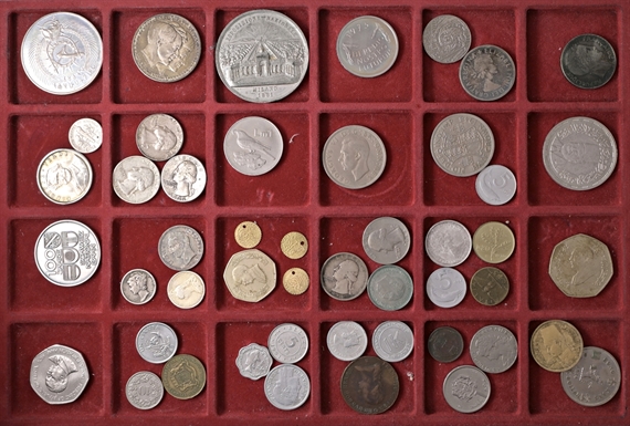 Accumulo famigliare con svariate monete, medaglie e pesi monetali: presenze in argento.