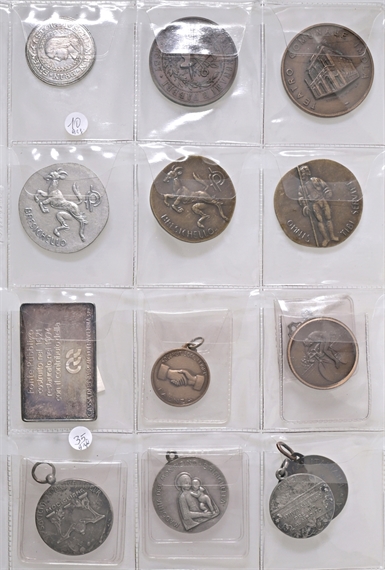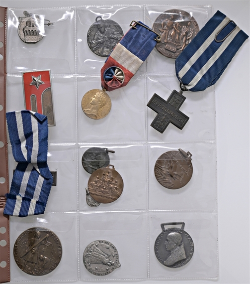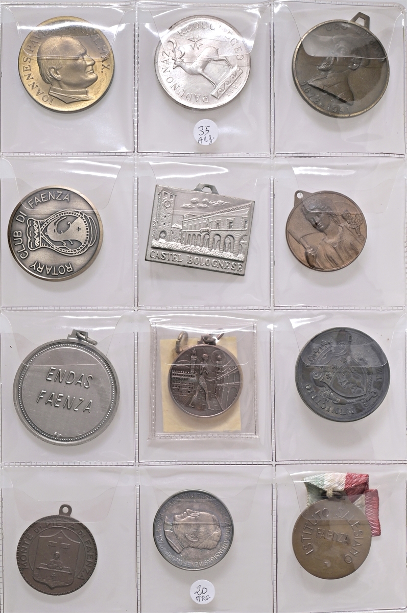 Interessante lotto di n. 77 medaglie compreso un lingotto in argento, distintivi. Vengono trattate le tematiche più svariate tra cui personaggi, Papi, diverse città della Romagna tra cui Faenza, Brisighella...