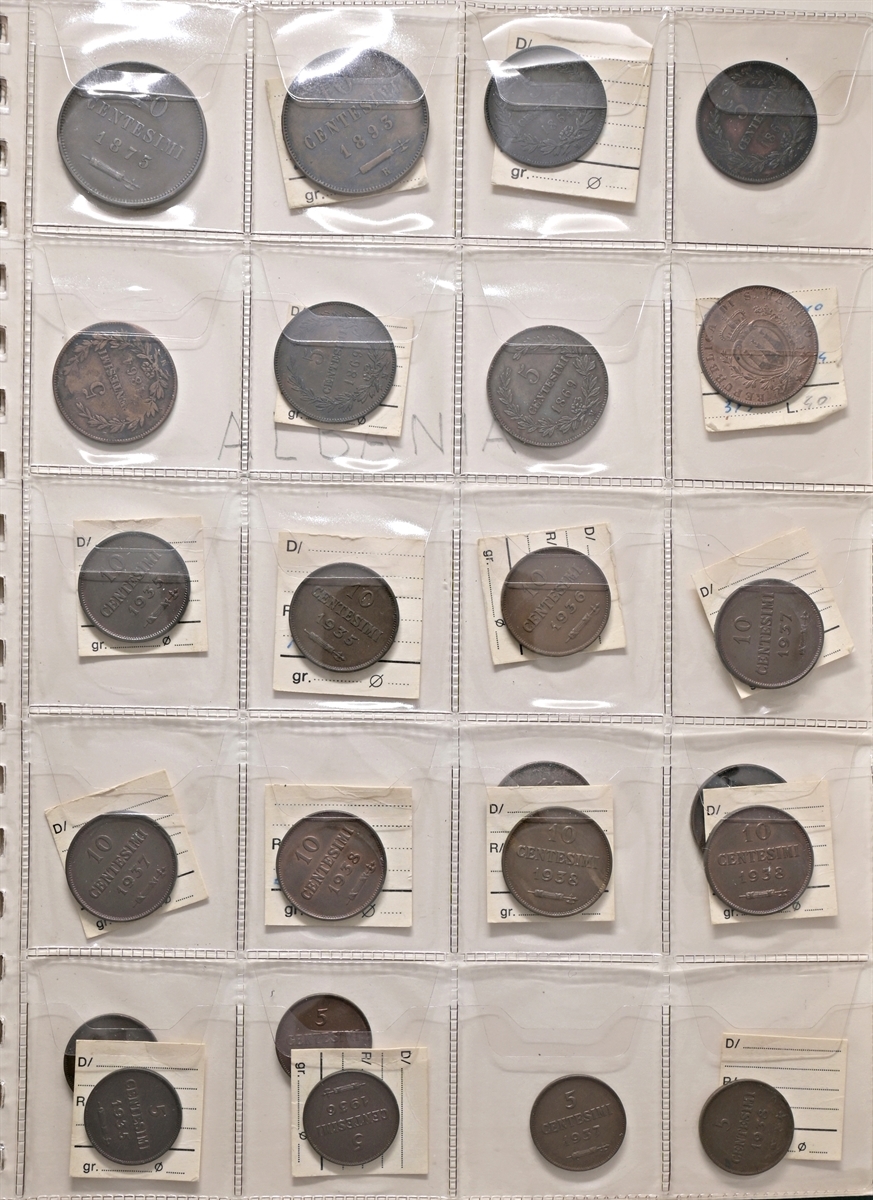 Residuo di collezione con monete di San Marino e Albania Italiana. Si segnalano per San Marino n. 25 esemplari da 5 e 10 centesimi dal 1864 al 1938.