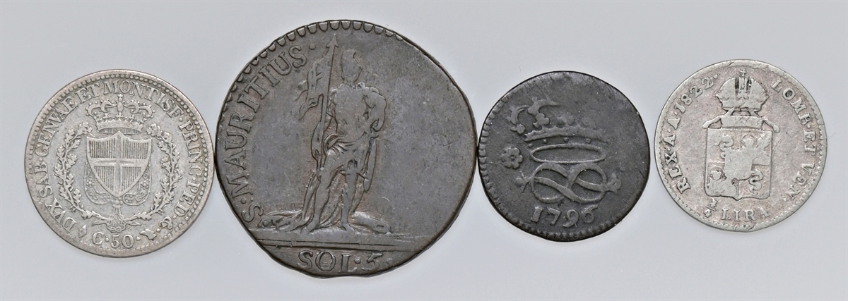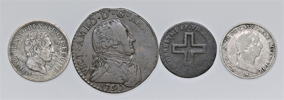 Lotto di n. 4 monete: si segnalano n. 2 monete in bronzo di Vittorio Amedeo III e n. 2 monete in argento, una da 50 centesimi di Carlo felice e un quarto di lira di Francesco I.