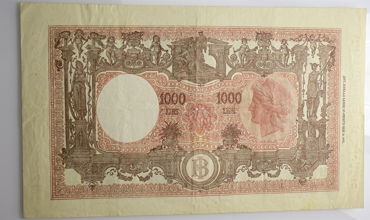 Filigrana: Nell'ovale testa dell'Italia turitta con stella; nel bordo verticale sinistro "BANCA D'ITALIA", in quello destro "LIRE 1000".