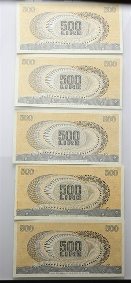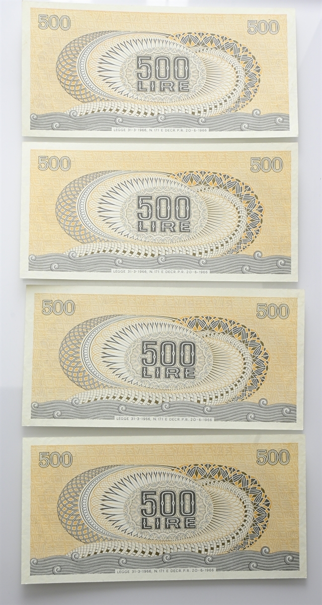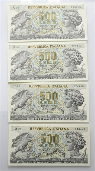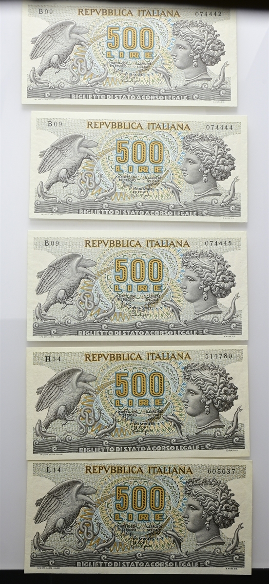 Lotto di 9 esemplari da 500 Lire Aretusa, 8 pezzi datati 1966 e 1 datato 1967.