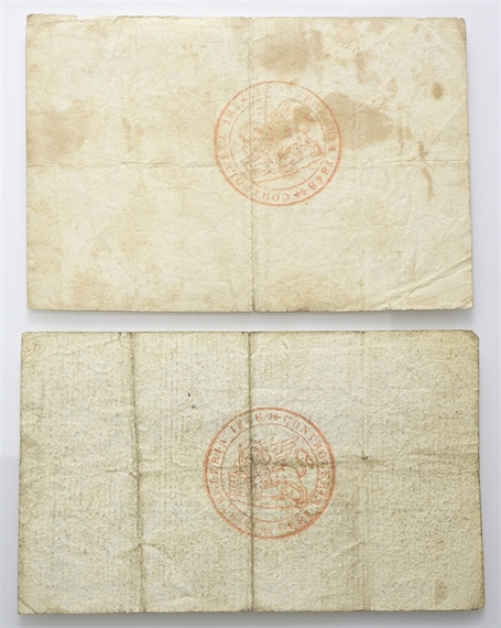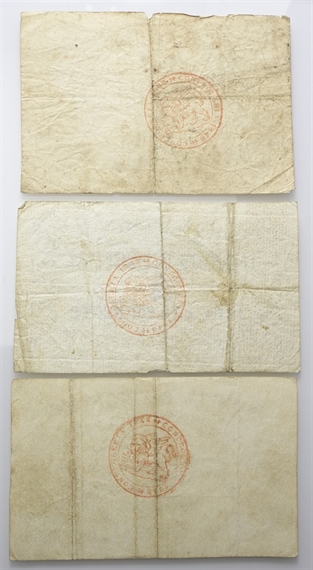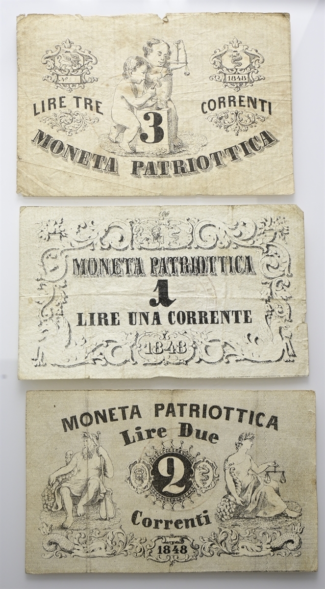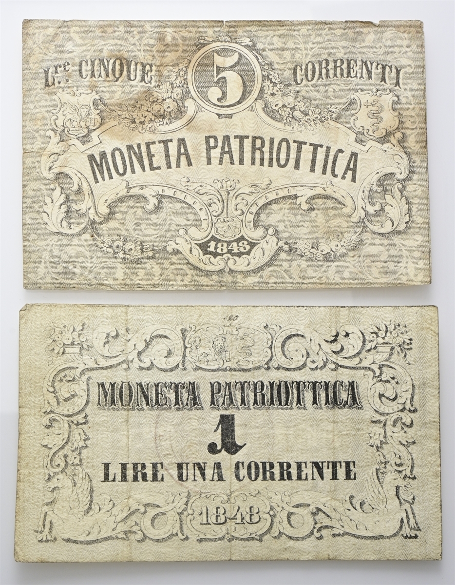 Lotto di 5 biglietti di Moneta Patriotica venezia: 2 da 1 Lira 1848, 1 da 2 Lire, 1 da 3 Lire e uno da 5 Lire.