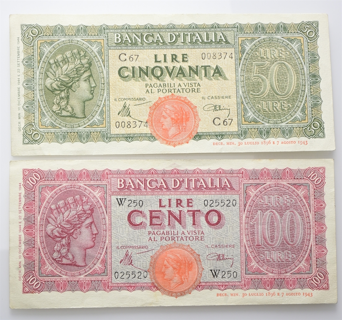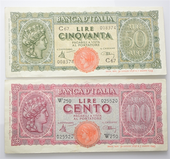 Luogotenenza. Coppia da 50 e 100 Lire Italia Turrita 1944 Banca d’Italia: si segnalano le 100 Lire W.