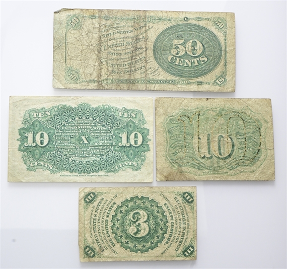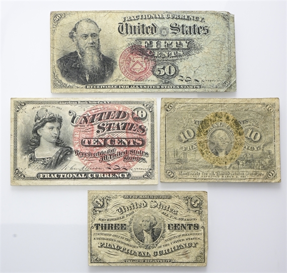 USA. Lotto di 4 banconote americane così composto: 50 cent VF PICK#120, 10 cent SPL PICK#115, 10 cent F PICK#108 e 3 cent VF Pick#105.