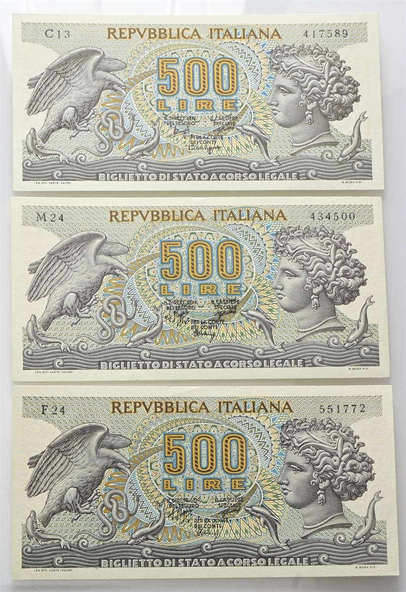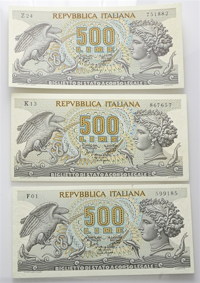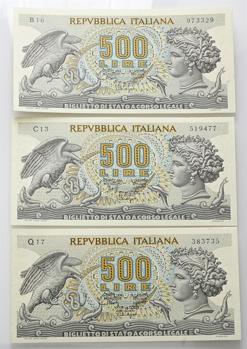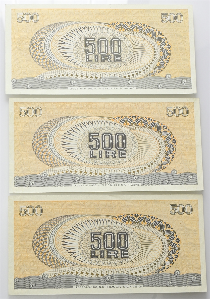 Vittorio Emanuele III e Repubblica Italiana. Lotto di 15 esemplari: 1+2 Lire +50 Lire Banca d’Italia e 9 esemplari da 500 Lire Repubblica 1966-67-1970 in FDS.+1 da 10 lire 1 da 100 lire +1 da 2000.