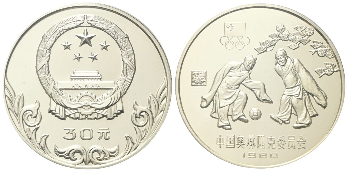 Repubblica Popolare Cinese, dal 1949. 30 Yuan Piedfort 1980. Giochi olimpici estivi, Mosca 1980 - Calcio.