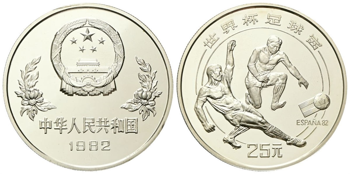 Repubblica Popolare Cinese, dal 1949. 25 Yuan, 1982, XII Coppa del mondo FIFA, Spagna 1982 - Competizione.