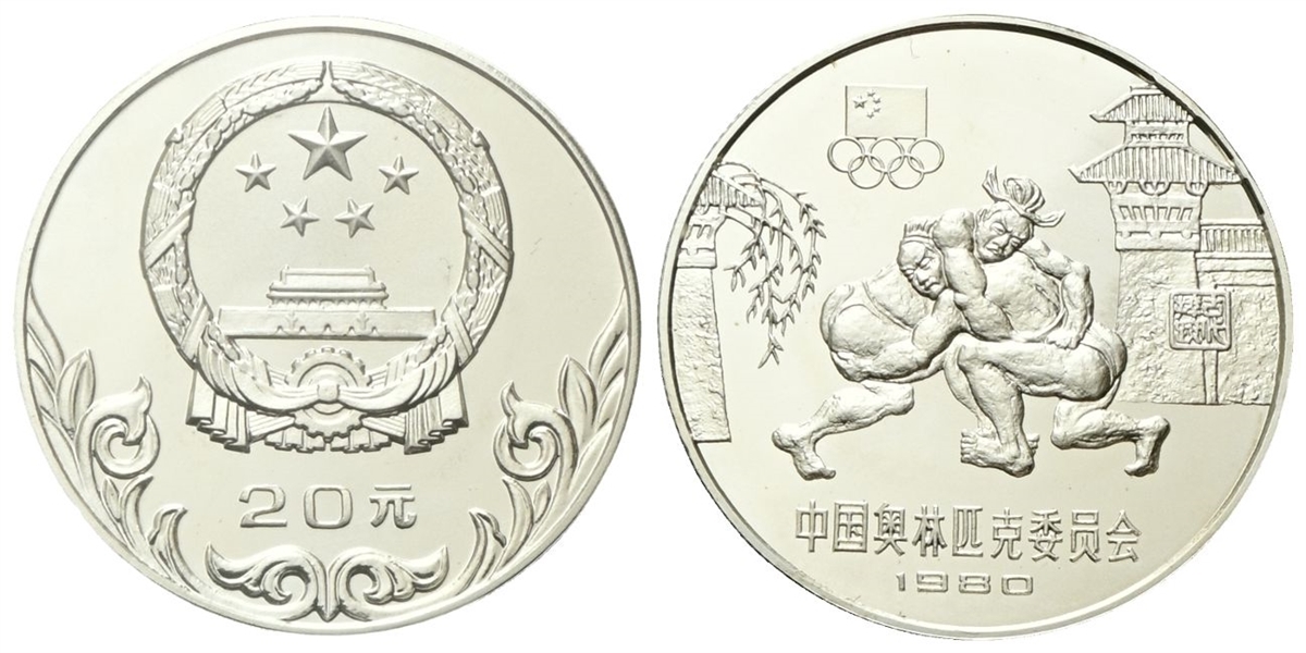 Repubblica Popolare Cinese, dal 1949. 20 Yuan 1980. Olimpiadi estive 1980 Mosca - lottatori.