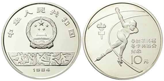 Repubblica Popolare Cinese, dal 1949. 10 Yuan 1984. Giochi olimpici invernali, Sarajevo 1984 - Pattinaggio di velocità.