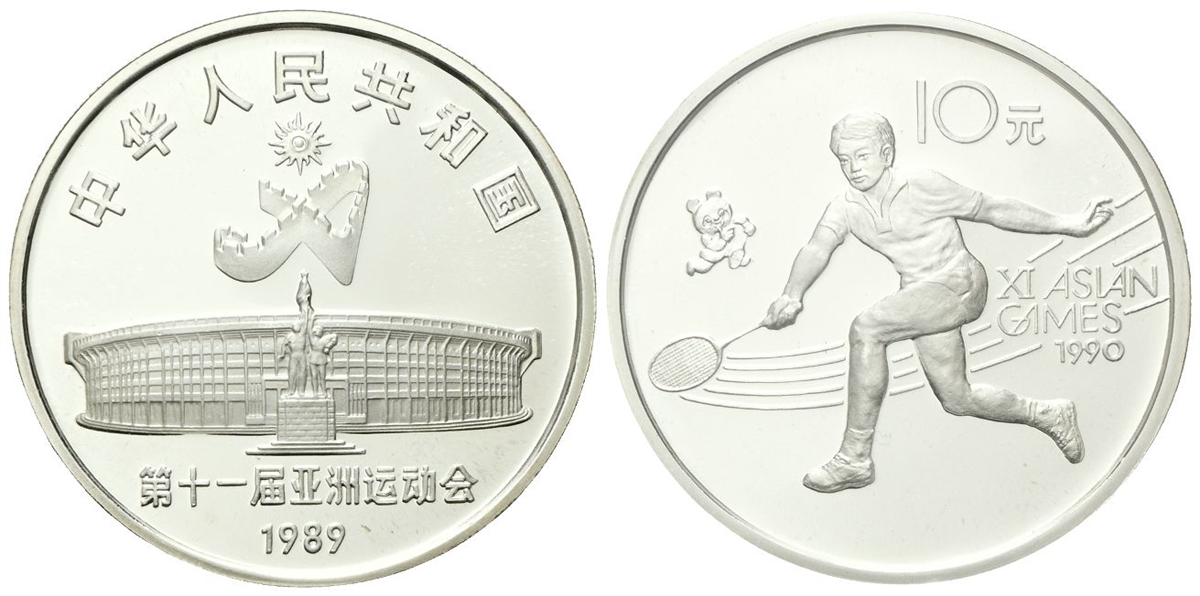 Repubblica Popolare Cinese, dal 1949. 10 Yuan 1989, Giochi asiatici, Pechino 1990 - Tennis.