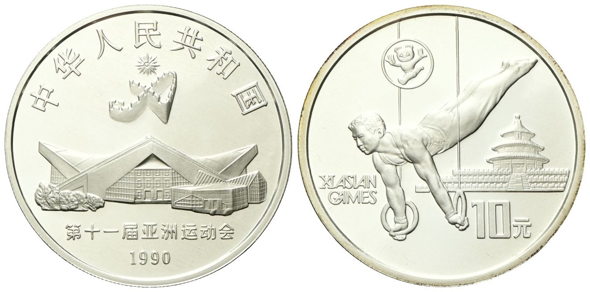 Repubblica Popolare Cinese, dal 1949. 10 Yuan 1990, Giochi asiatici, Pechino 1990 - Ginnasta sugli anelli.