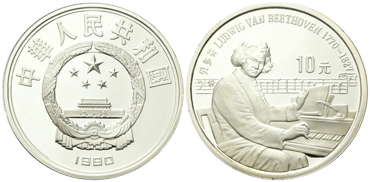 Repubblica Popolare Cinese, dal 1949. 10 Yuan 1990. Personalità mondiali - Ludwig van Beethoven.