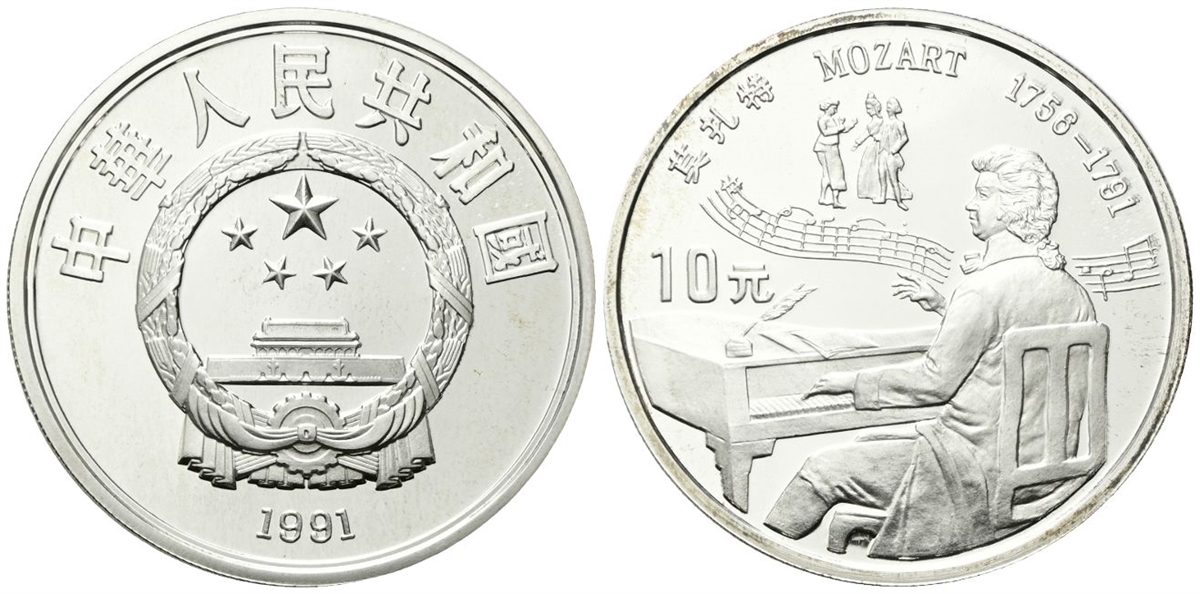 Repubblica Popolare Cinese, dal 1949. 10 Yuan 1991, Personalità mondiali - Wolfgang Amadeus Mozart.