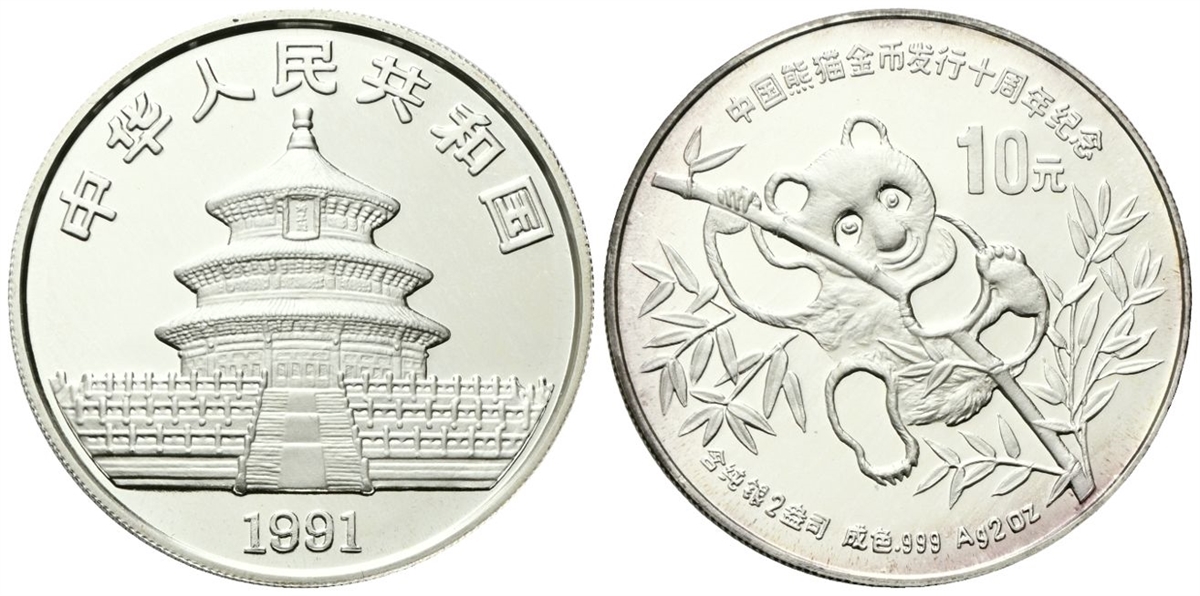 Repubblica Popolare Cinese, dal 1949. 10 Yuan 1991 Panda,Decimo anniversario della serie Panda.