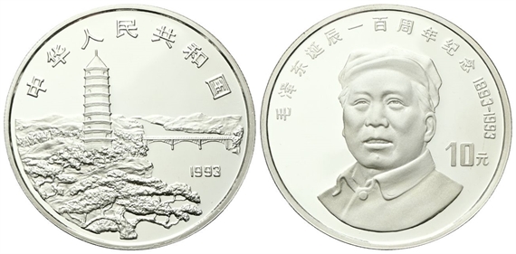 Repubblica Popolare Cinese, dal 1949. 10 Yuan 1993. 100° anniversario dellla nascita di Mao Zedong.