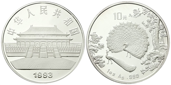 Repubblica Popolare Cinese, dal 1949. 10 Yuan 1993. Antichi dipinti. Pavone.