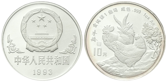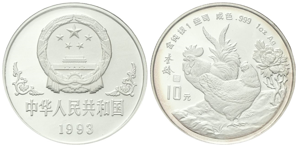 Repubblica Popolare Cinese, dal 1949. 10 Yuan 1993. Calendario cinese - Anno del gallo.