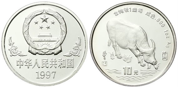 Repubblica Popolare Cinese, dal 1949. 10 Yuan 1997. Calendario cinese - Anno del bufalo.