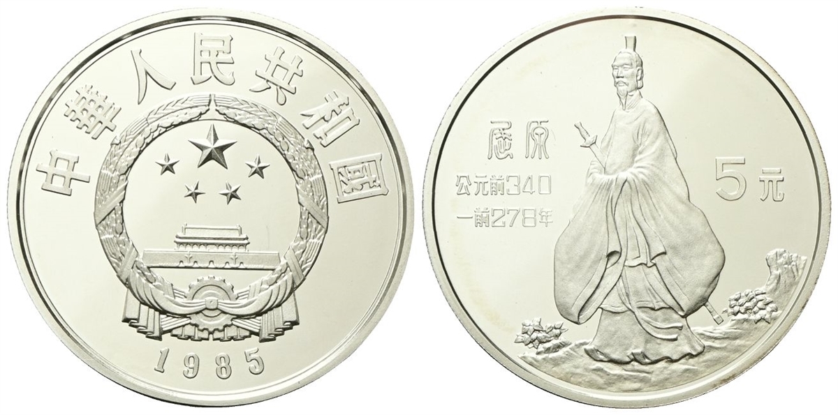 Repubblica Popolare Cinese, dal 1949. 5 Yuan 1985. Personalità cinesi - Qu Yuan.