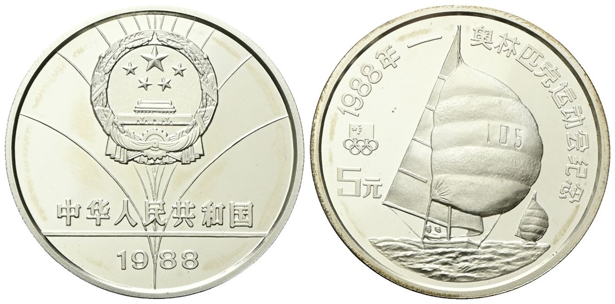 Repubblica Popolare Cinese, dal 1949. 5 Yuan 1988. Olimpiadi estive del 1988, Seul - Sailboat Racing.