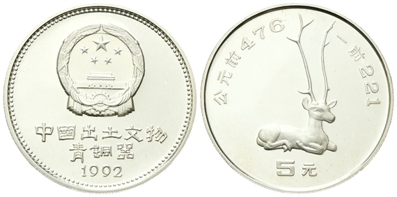 Repubblica Popolare Cinese, dal 1949. 5 Yuan 1992. Reperti dell'età del bronzo - cervo.
