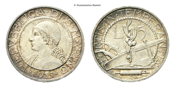 SAN MARINO - Vecchia monetazione, 1864-1938. - 5 Lire 1935.