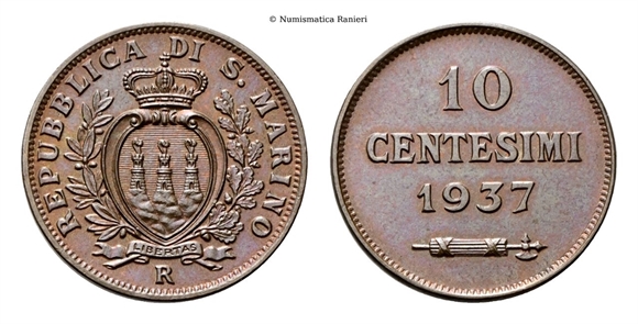 SAN MARINO - Vecchia monetazione, 1864-1938. - 10 Centesimi 1937.