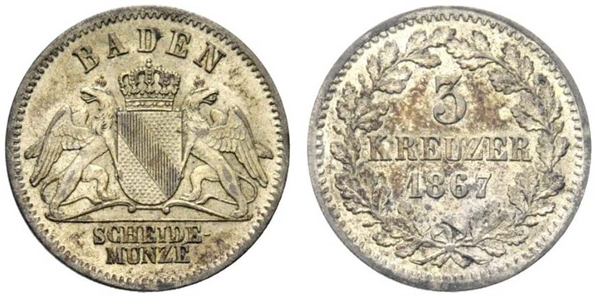 GERMANIA - Baden. Friedrich I, 1852/1856-1907. - 3 kreuzer 1867.