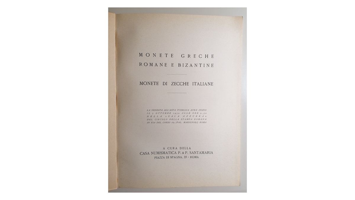 Ditta – P.& P. Santamaria – Roma. Monete Greche Romane e Bizantine. Monete di Zecche Italiane. La Vendita all’Asta pubblica avrà inizio il 7 Ottobre 1959.