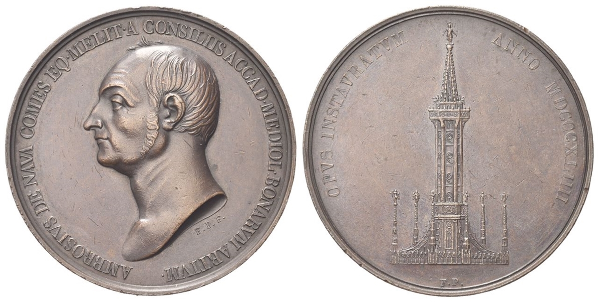 Dr. AMBROSIVS DE NAVA COMES EQ MELIT A CONSILIIS ACCAD MEDIOL BONARVM ARTIVM. Testa nuda a s.; sotto troncamento in lettere minuscole, F.P.F. Rv. OPVS INSTAVRATVM - ANNO MDCCCXLIIII. La Torre con la lanterna della Madonnina sul Duomo di Milano.