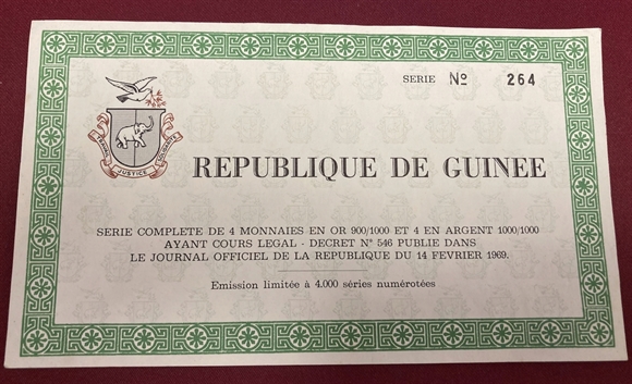 GUINEA - Repubblica, dal 1958. - Serie completa di 8 valori (100, 200, 250, 500 Franchi in argento e 1.000, 2.000, 5.000 e 10.000 Franchi in oro) 1969.