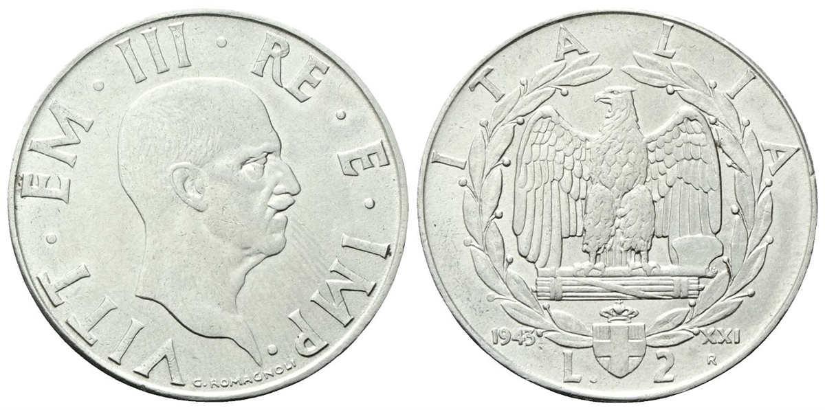 Vittorio Emanuele III, 1900-1943. 2 Lire 1943 a. XXI Roma, Impero.