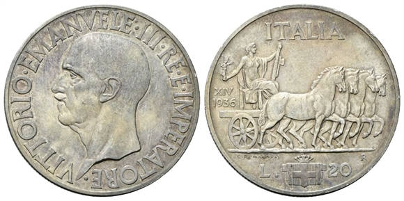 Vittorio Emanuele III, 1900-1943. 20 Lire 1936 a. XIV Roma, Quadriga Impero.