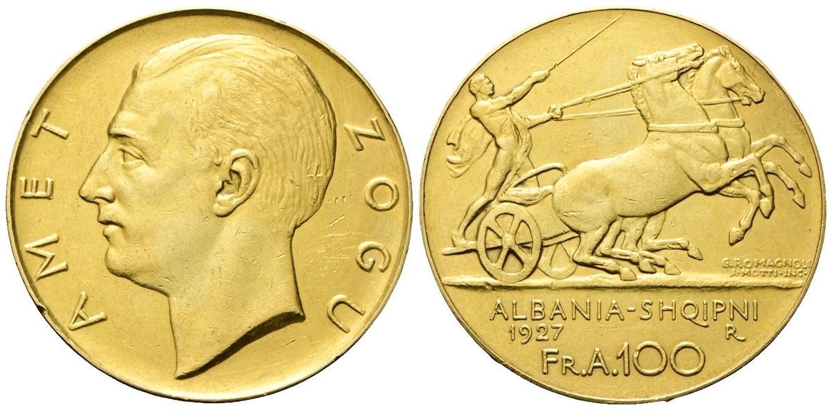 ALBANIA - Re Zogu I, 1925-1939. - 100 Franga Ari 1927, zecca di Roma.