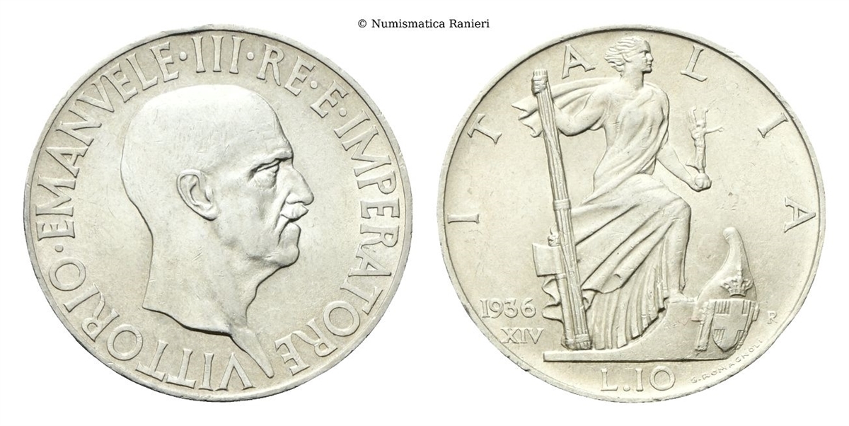 Vittorio Emanuele III, 1900-1943. 10 Lire 1936 a. XIV Roma, Impero.