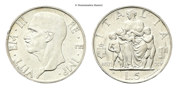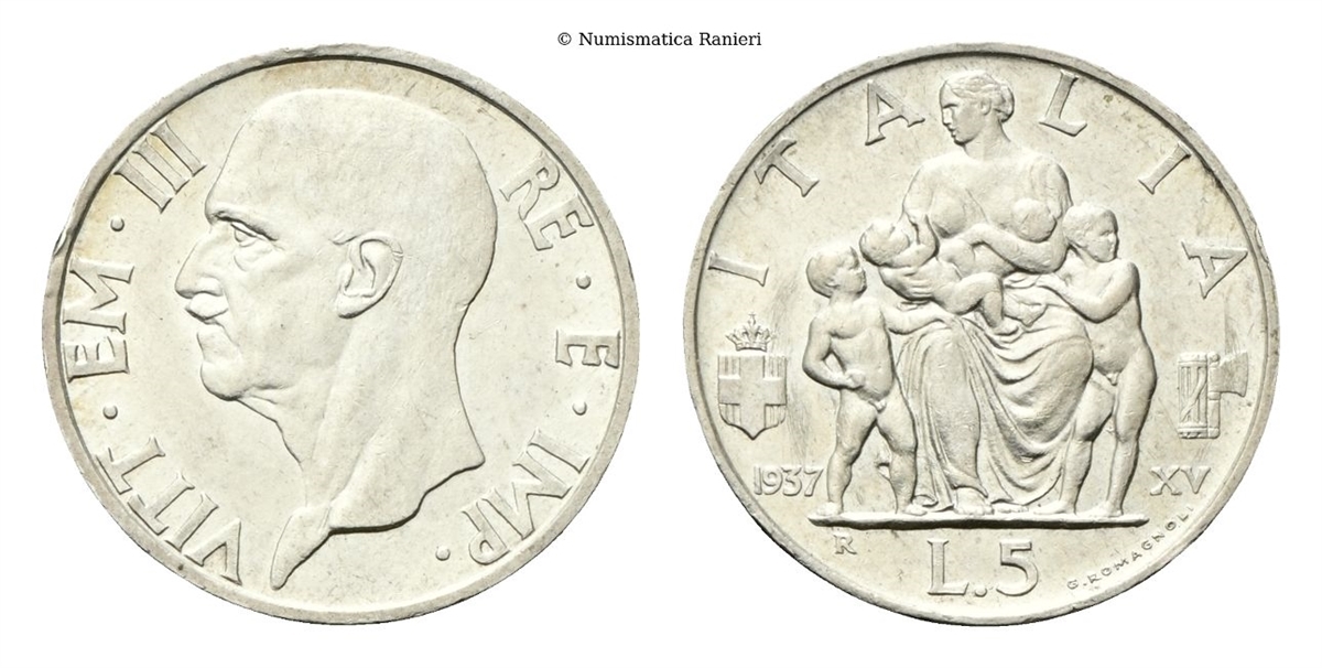 Vittorio Emanuele III, 1900-1943. 5 Lire 1937 a. XV Roma, Fecondità.